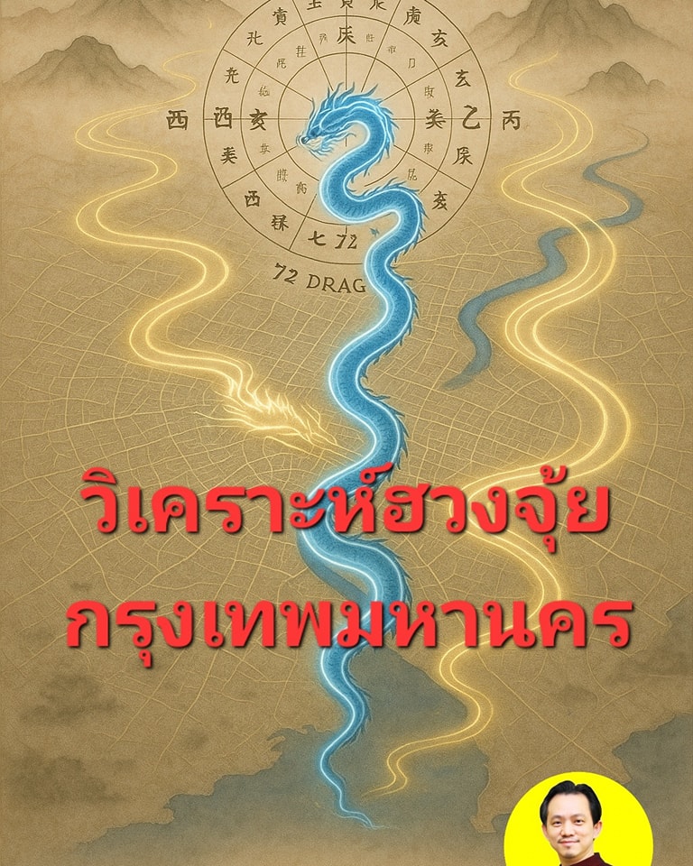 กรุงเทพมหานครถูกสร้างขึ้นบนชัยภูมิที่พิเศษตามหลักฮวงจุ้ยโบราณ โดยถือเป็นเมืองที่ตั้งอยู่บนเส้นทางของ "มังกรน้ำ" ซึ่งก็คือแม่น้ำเจ้าพระยานั่นเอง พลังงานจากแม่น้ำจะไหลจากทิศเหนือลงสู่ทะเลในทิศใต้ ซึ่งสอดคล้องกับหลักการของฮวงจุ้ยหยางกงในระบบ 72 มังกรที่เรียกว่า "丁山癸向" หรือ "มังกรหยินธาตุไฟ"